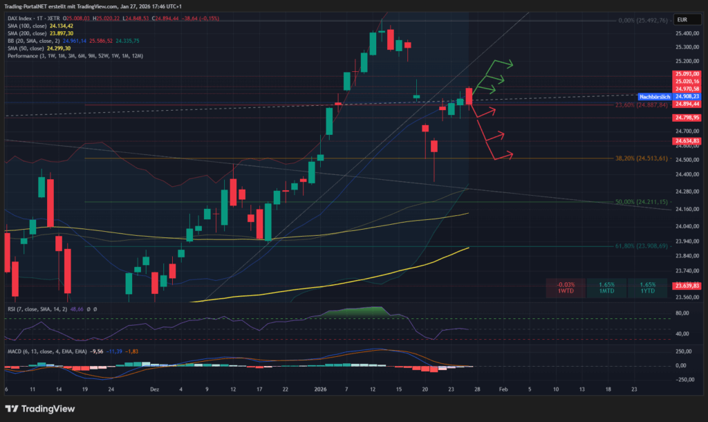 - Oberhalb wäre die Spanne über die 24.970 (m. B.) zur 25.000/25.020 weiter aktiv. Darüber rückt die nächste Gap-Zone in den Fokus mit der 25.090 als weitere Marke. Im Anschluss das Gap-Close und Widerstandszone 25.170/.200.