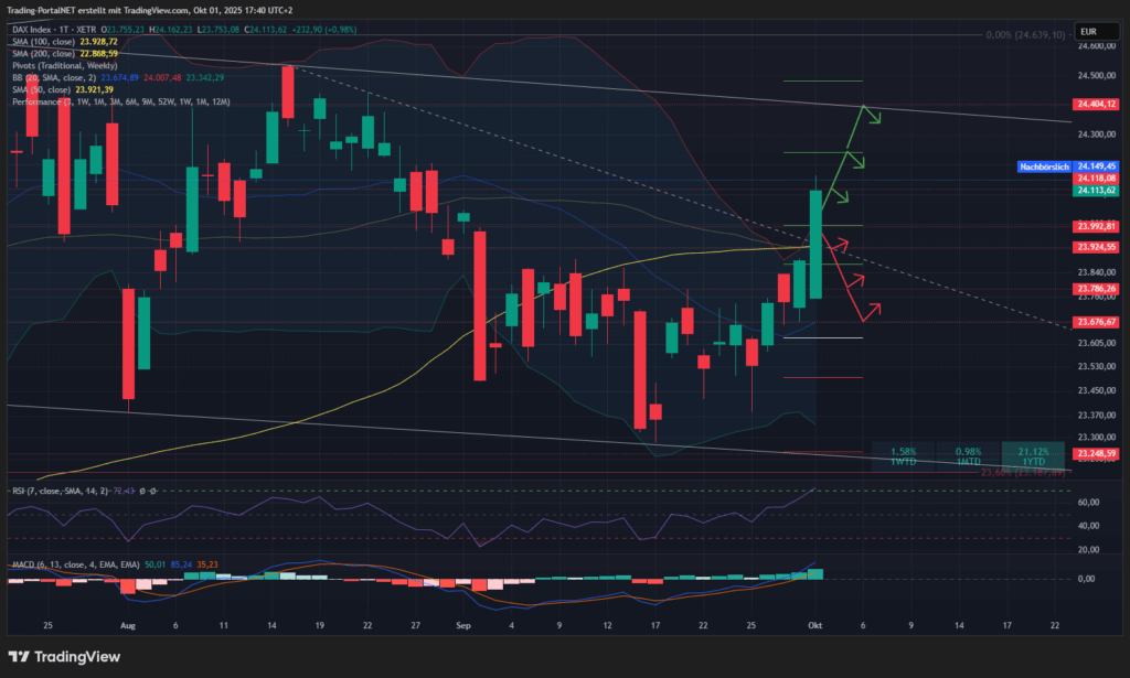 Die Märkte eröffneten das vierte Quartal mit einem gemischten Bild. Während der DAX nach seinem schwachen dritten Quartal mit Schwung in den Oktober startete und sich als Outperformer zeigte, verläuft der Auftakt an der Wall Street etwas verhaltener. Oberhalb von 23.950 Punkten haben die Bullen im DAX jedoch gute Karten, den Druck in Richtung 24.400 Punkte auszubauen. Historisch gilt das vierte Quartal ohnehin als das stärkste des Jahres.