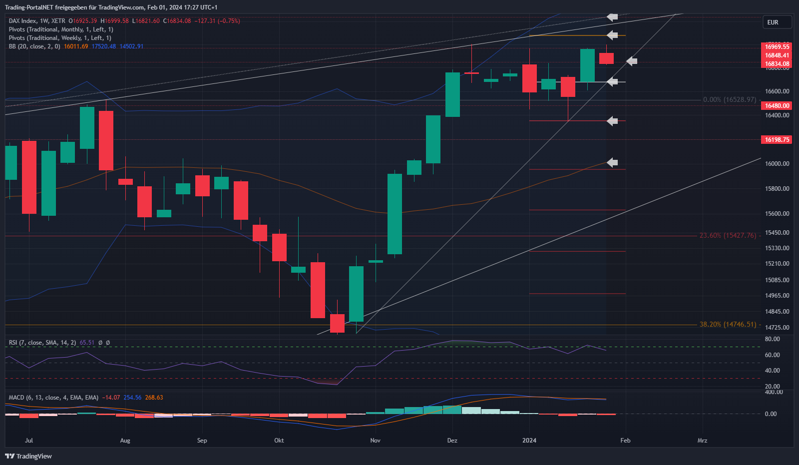 Der Blick zum Wochenchart, wo der DAX seine Bullenflagge nach oben auflösen konnte. Ein neues Allzeithoch blieb ihm trotz der weiterhin starken Wall Street jedoch verwehrt. Die Konsolidierung innerhalb der Flagge ist mit dem 23,6-er Fibu-Level sehr flach verlaufen und hält die Wahrscheinlichkeit hoch, dass der Flaggenausbruch noch zur Konsolidierung gehört und ein vorzeitiges Ende finden wird. Saubere Konsolidierungsziele nach der Novemberrallye sollten eigentlich bis unter die 16k führen. Bei aufkommender Dynamik über die 17.1 muss jedoch davon ausgegangen werden, dass die Konsolidierung in der Tat flach beendet wurde und ein neuer Aufwärtsimpuls bereits läuft. Die neue Woche wird viele starke Impulsgeber liefern. Die 16.680 stellen den ersten relevanten Bereich auf Wochensicht. Oberhalb bleibt die Range zum AZH und aktiv. Direkt darüber die 17.080. Anschließend 17.200. Bei Bruch 17.4/.450. Unterhalb wäre hingegen der Cluster über die 16.480 zur 16.350 zu nennen. Darunter dürfte die Konsolidierung zur 16.2 fortgesetzt werden. Bei Bruch 15.950 (m. Bollinger).